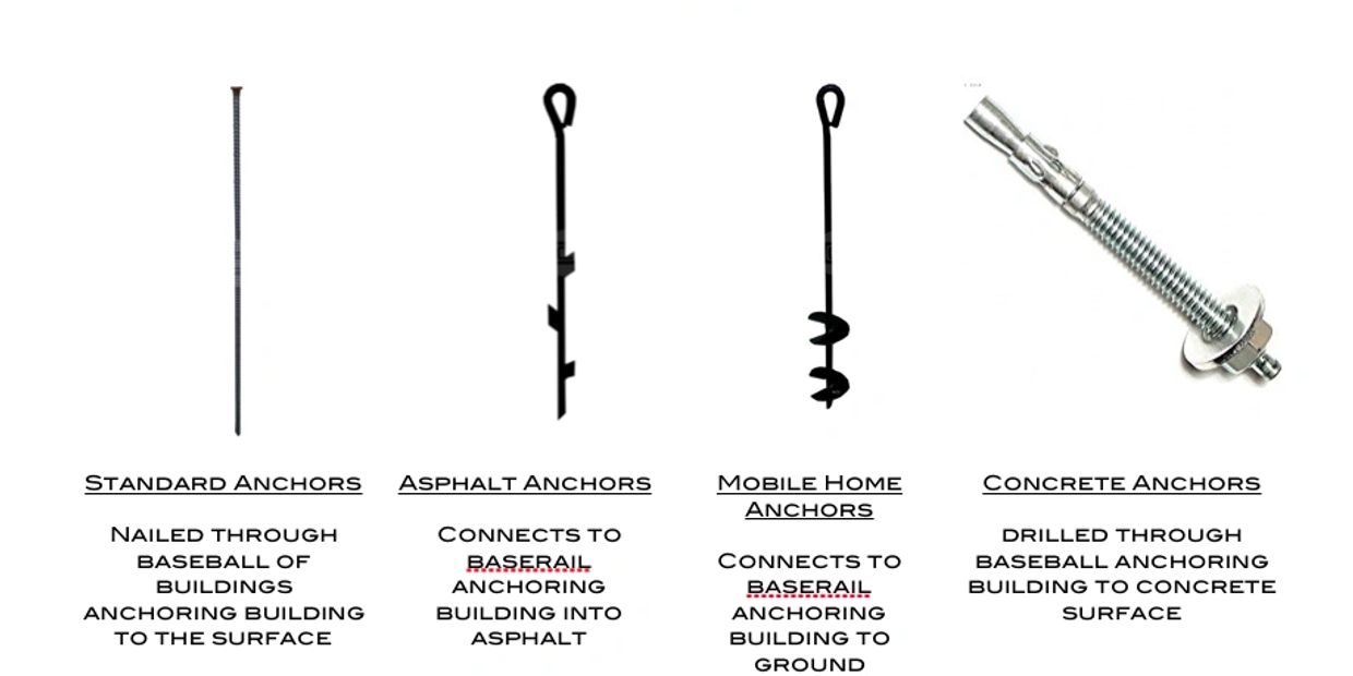 Asphalt Anchors For Carports. Asphalt Anchor These anchors are used in asphalt installations only and may or may not be included with the building. - Ground Asphalt Wood or Concrete Anchors included.